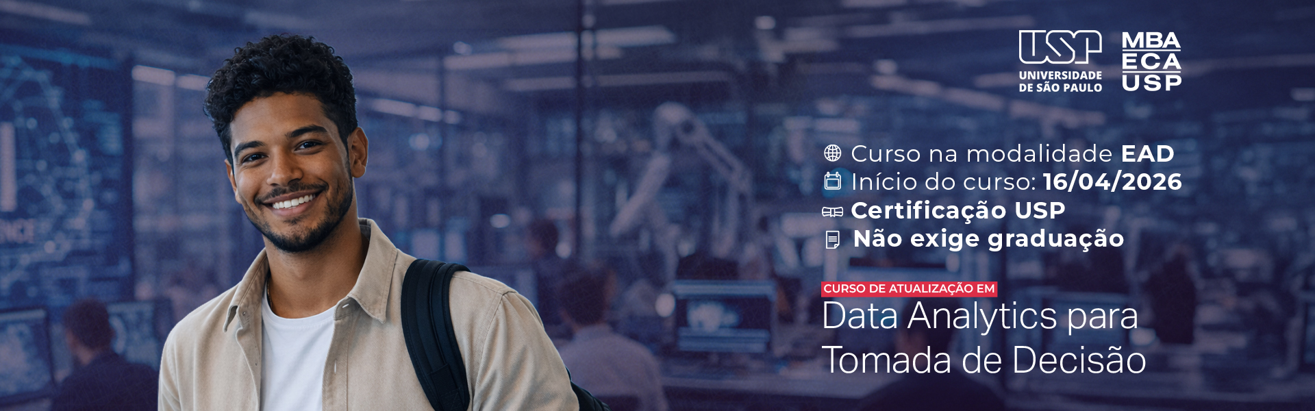 O Curso de Atualização Data Analytics para Tomada de Decisão, oferecido pela USP – Universidade de São Paulo, foi desenvolvido para profissionais de diversas áreas que desejam entender e aplicar análise de dados, estatística e Business Intelligence no contexto dos negócios, mesmo sem experiência prévia com programação ou diploma de graduação.