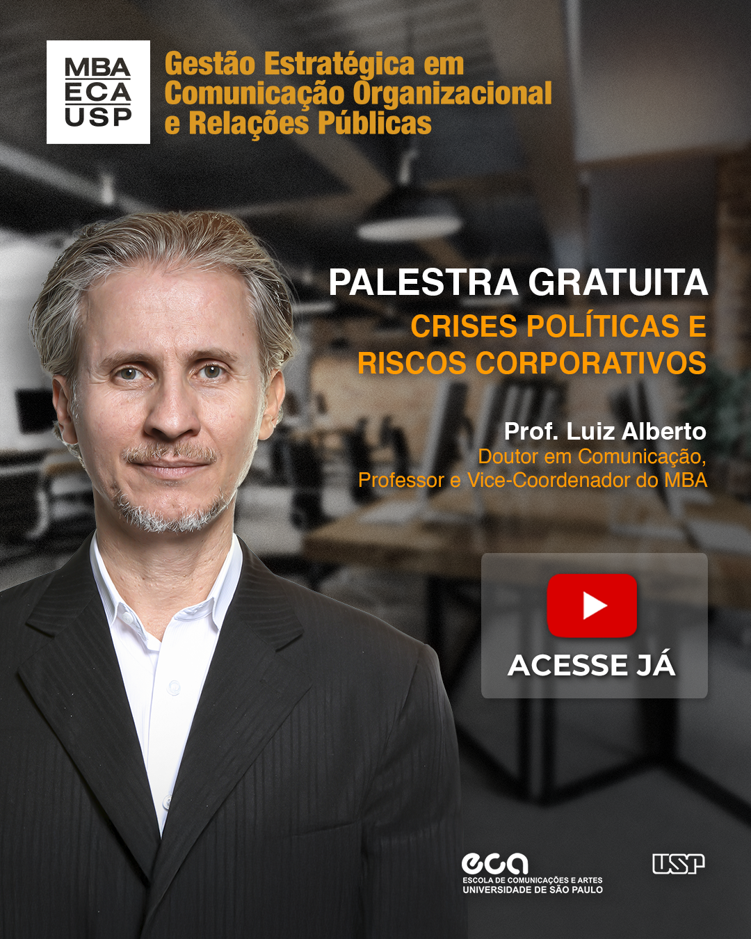 Na palestra “Crises Políticas e Riscos Corporativos”, o Prof. Luiz Alberto Beserra de Farias — doutor em Comunicação e vice-coordenador do MBA GESTCORP da ECA-USP — conduz uma análise aprofundada sobre como instabilidades políticas impactam diretamente a gestão das organizações e seus riscos corporativos.