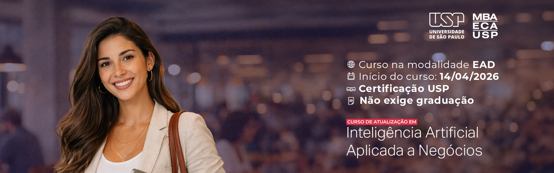 O curso de atualização em Inteligência Artificial Aplicada a Negócios, oferecido pela USP – Universidade de São Paulo, foi desenvolvido para profissionais de todas as áreas que desejam dominar essa tecnologia, mesmo sem formação prévia em tecnologia ou graduação completa.