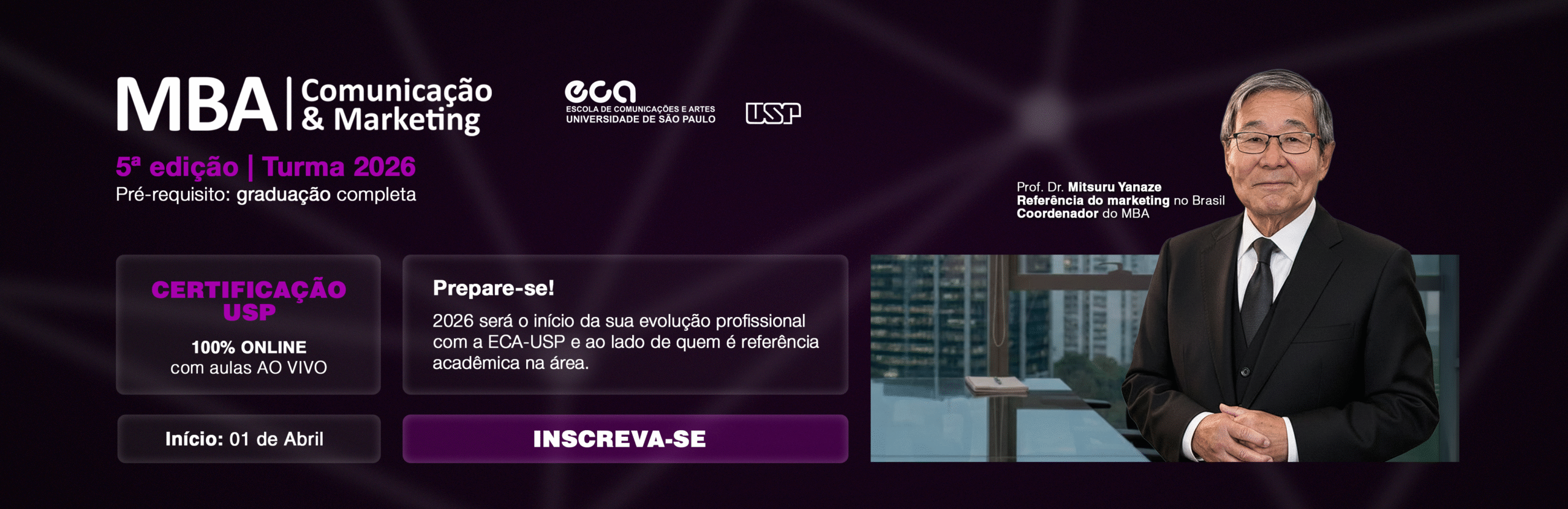 O MBA Comunicação e Marketing EAD da ECA-USP é um curso completo, inovador e prático, ideal para profissionais que buscam se destacar no mercado de trabalho e alavancar suas carreiras em marketing estratégico e comunicação empresarial.