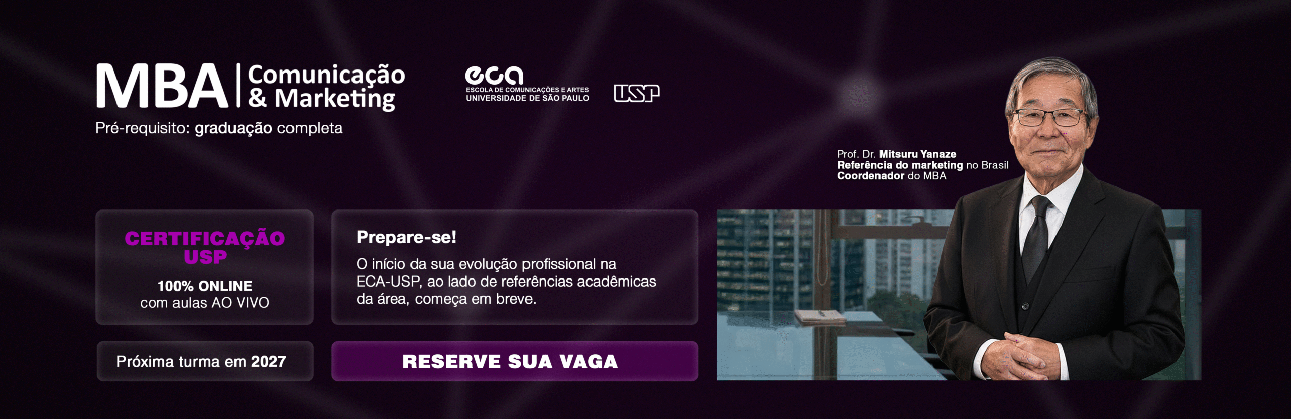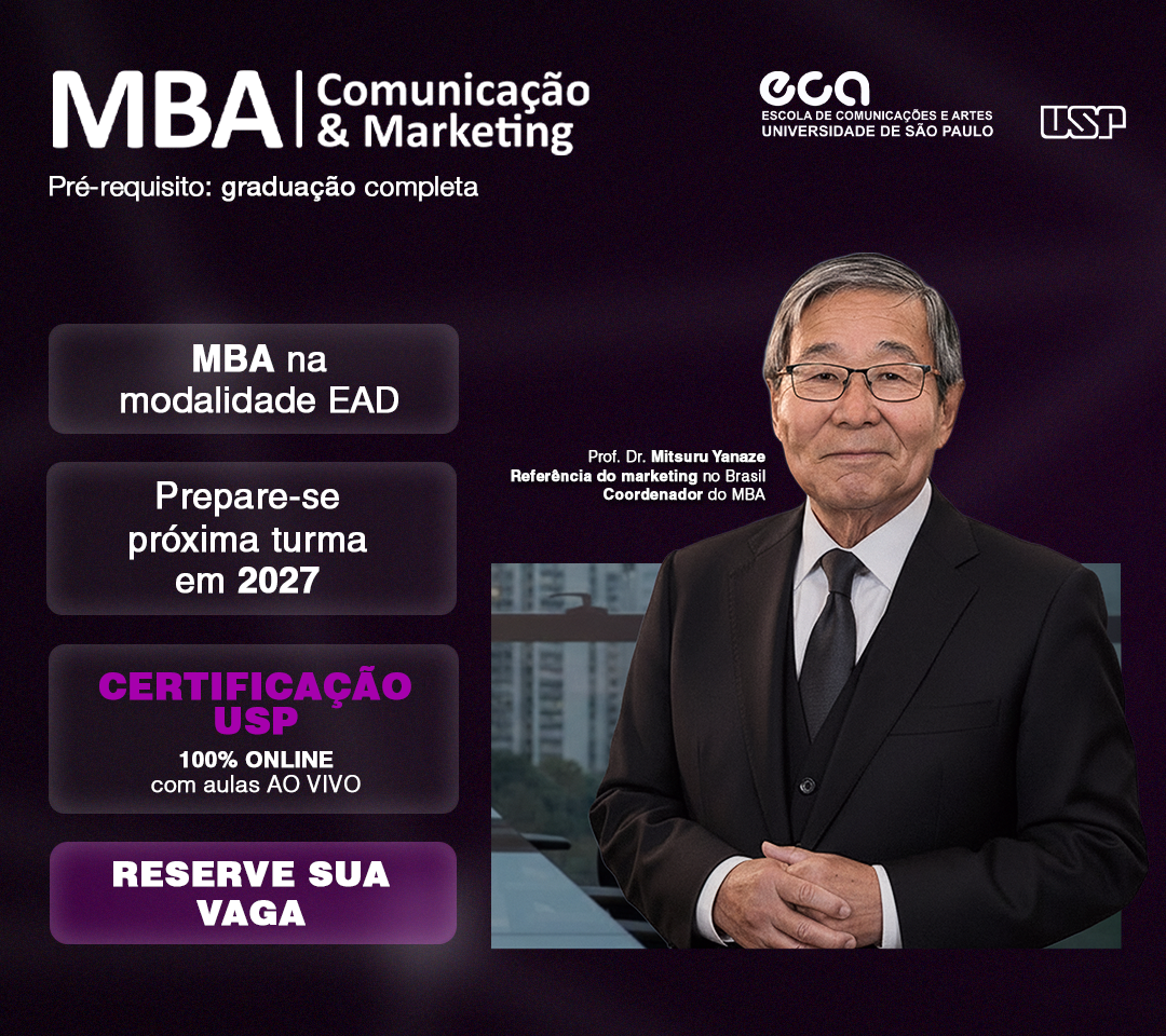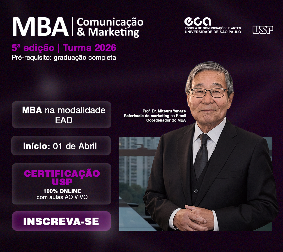 O MBA Comunicação & Marketing EAD da ECA-USP é conduzido por professores da Universidade de São Paulo e especialistas atuantes no mercado, unindo base teórica sólida e prática aplicada para formar profissionais completos e atualizados.