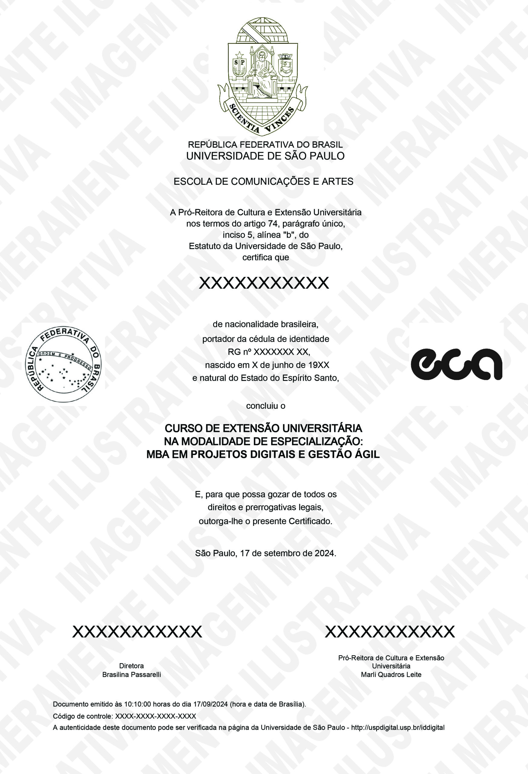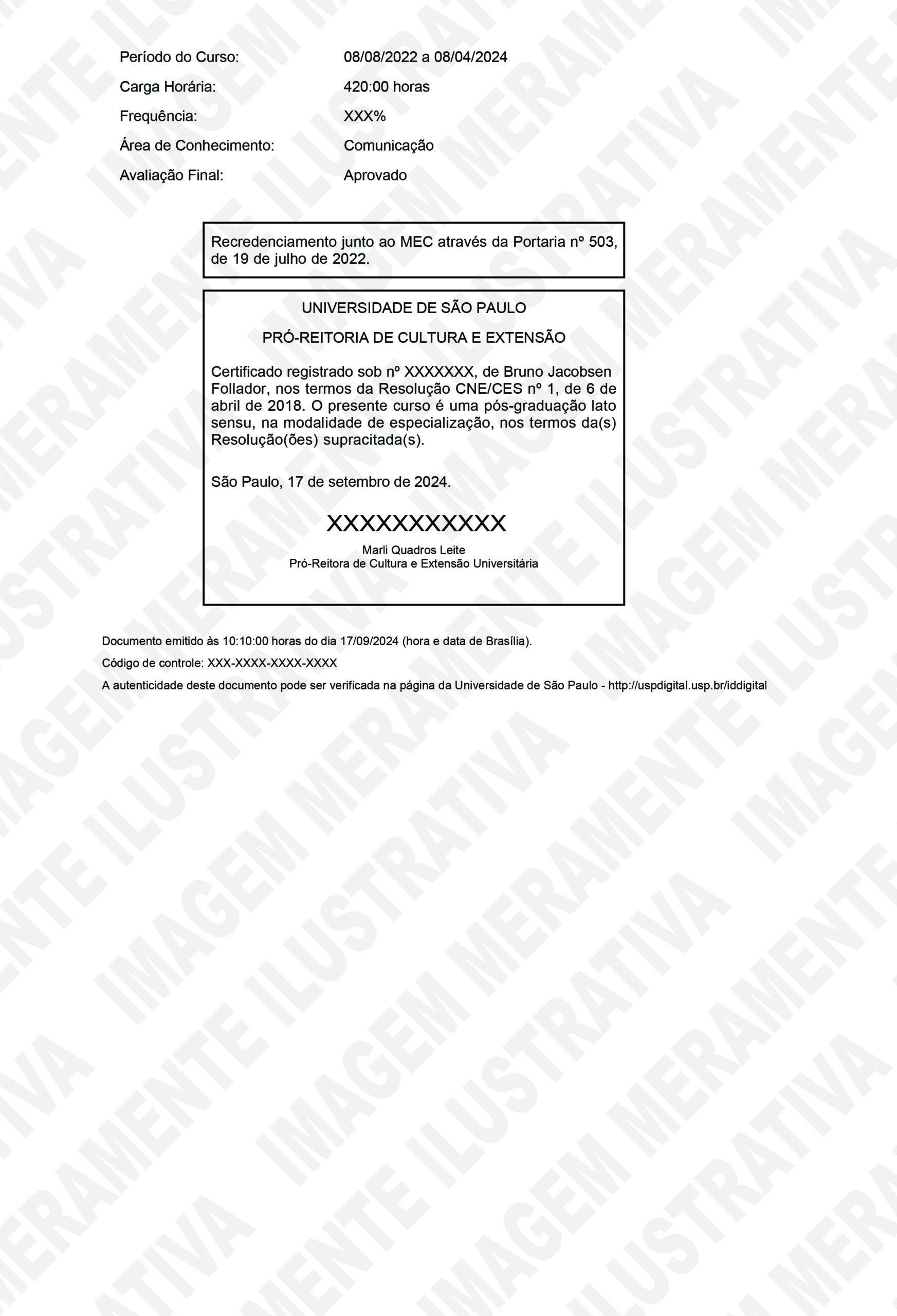 Certificação oficial da Universidade de São Paulo, emitida em formato digital e com versão impressa disponibilizada posteriormente.