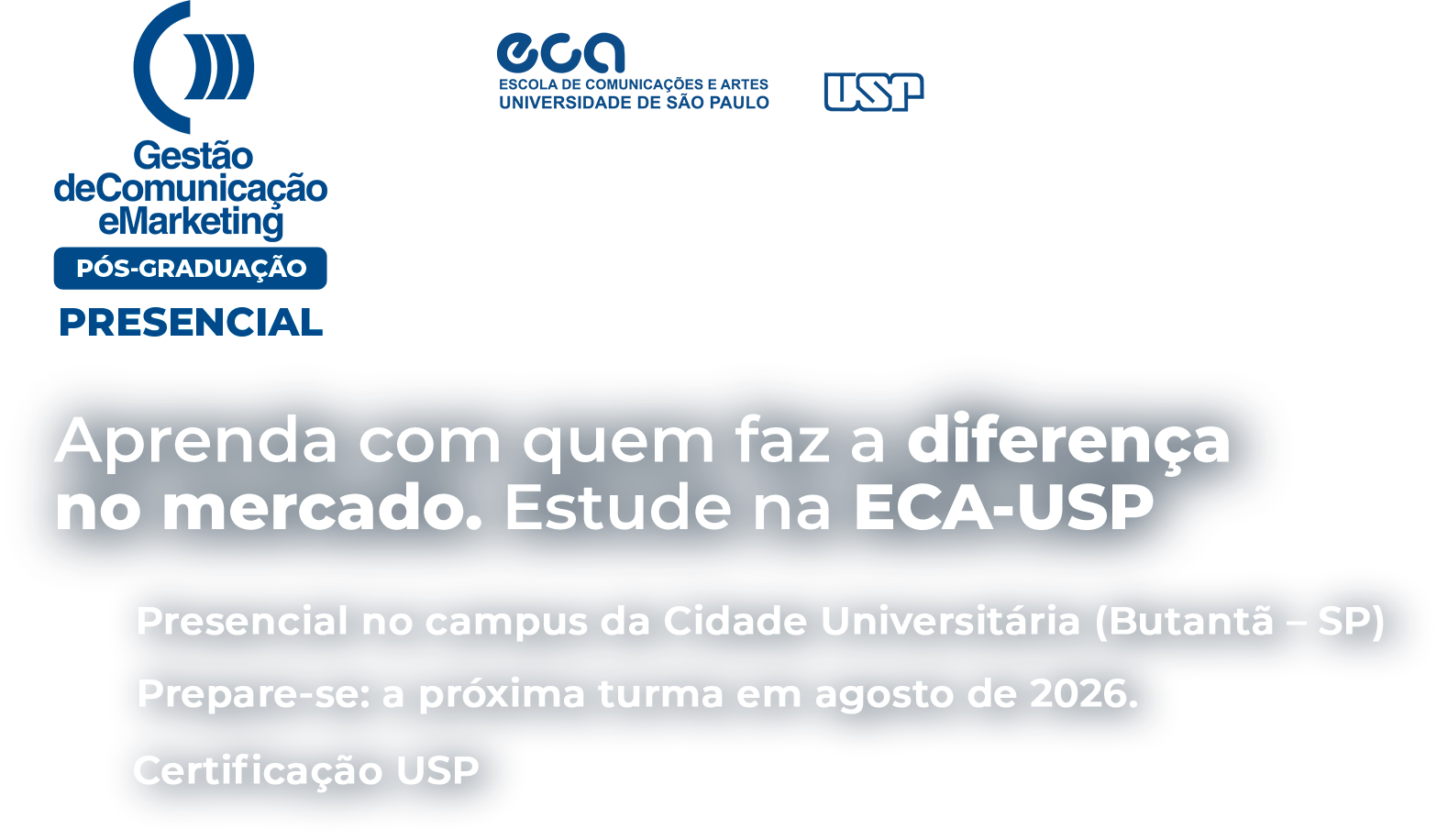 A Pós-Graduação em Gestão de Comunicação e Marketing – ECA-USP é uma formação estratégica e aplicada, que capacita profissionais para atuar com alto desempenho na comunicação organizacional, no marketing e na gestão de marcas em um cenário cada vez mais dinâmico e integrado.